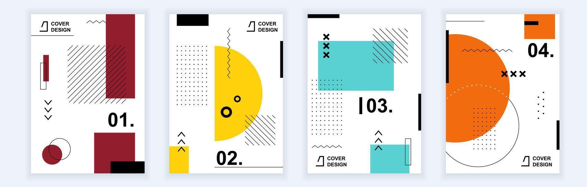 Abstract brochure covers set in modern minimal geometric design. Memphis style background templates with graphic elements in A4 format for business presentation and identity. Vector illustration Pro Vector