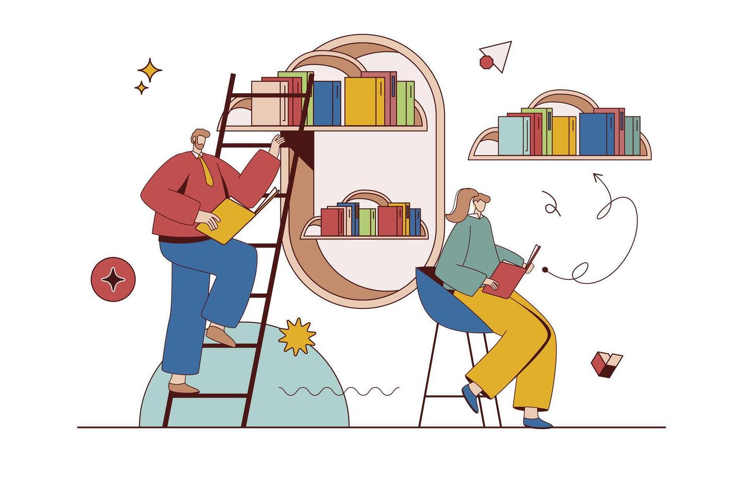 Cloud library concept with character situation in flat design. Man and woman reading online books and store files using archives with cloud technology. Vector illustration with people scene for web Pro Vector