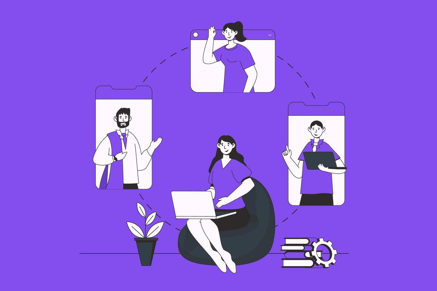Remote team web concept with character scene in flat design. People discussing tasks, talking in group video call programm, working together. Vector illustration for social media marketing material. Pro Vector