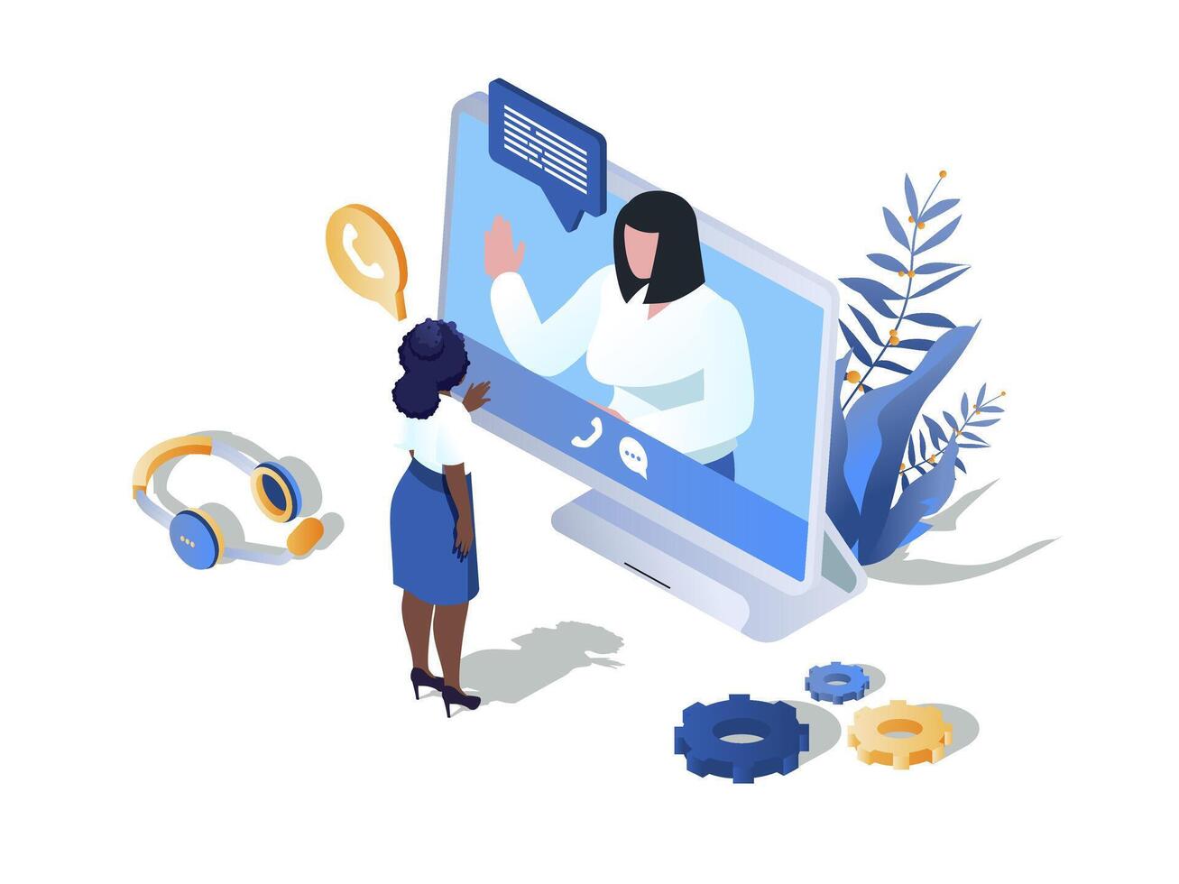 Online video call concept 3d isometric web scene. People talking in video programm, discussing work tasks, distant consulting at virtual conference. Vector illustration in isometry graphic design Pro Vector