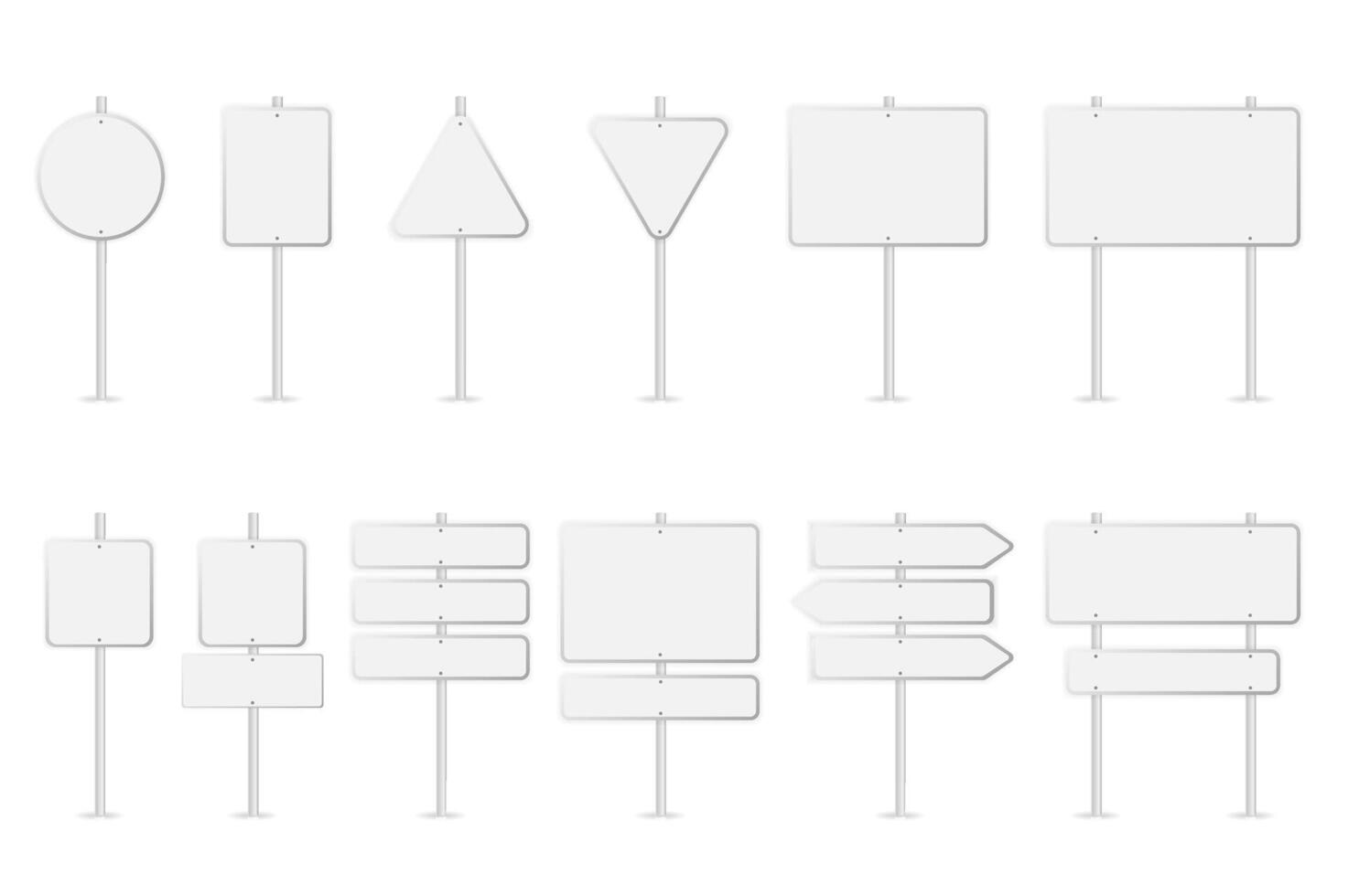 Road signs mega set elements in flat design. Bundle of white street signposts template with different shapes. Blank traffic pointers with arrow directions. Vector illustration isolated graphic objects Pro Vector