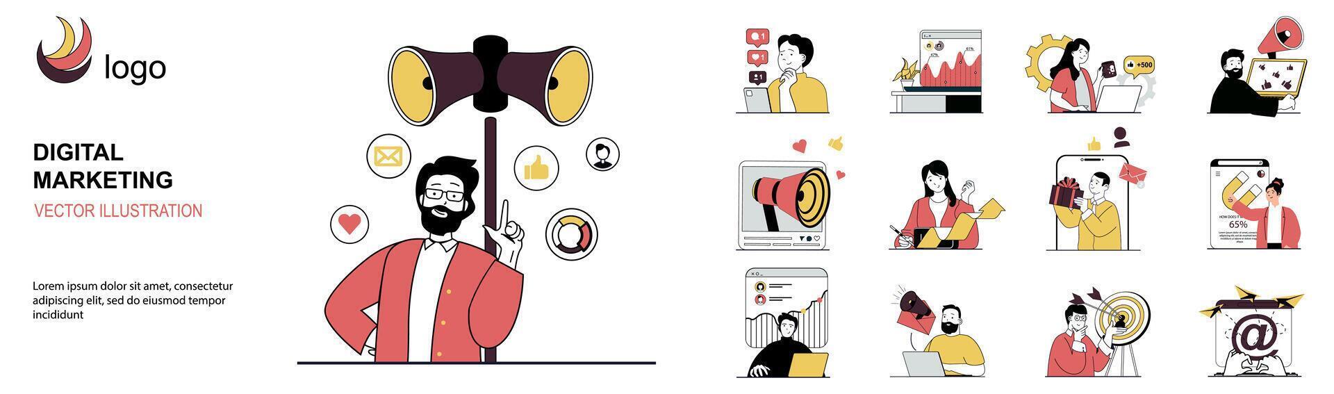 Digital marketing concept with character situations collection. Bundle of scenes people promoting business in social media, targeting and attracting clients. Vector illustrations in flat web design Pro Vector