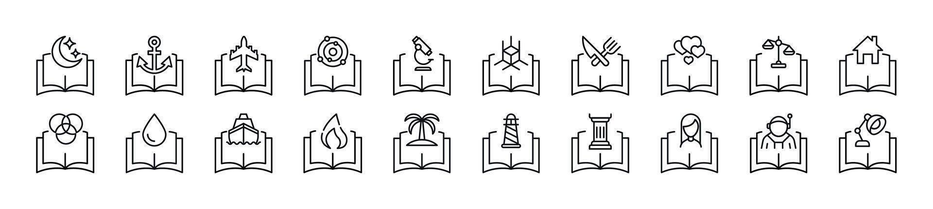 Items over books linear vector icons collection. Editable stroke. Simple linear illustration for web sites, newspapers, articles book Pro Vector