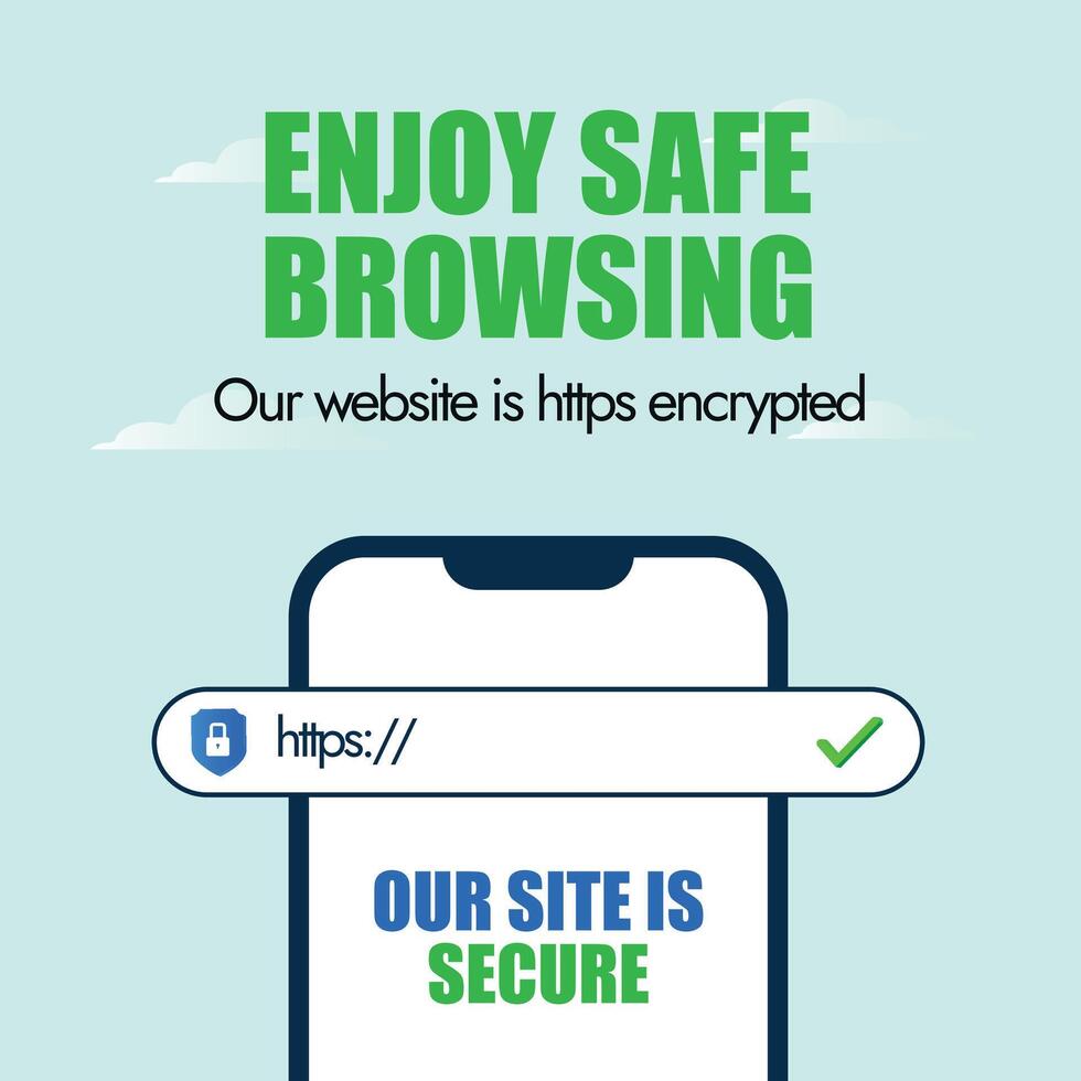 Safe website banner. Enjoy safe browsing announcement banner with mobile phone screen and search bar with https written on it. Encrypted HTTPS for security of users data. Our site is secure. Pro Vector