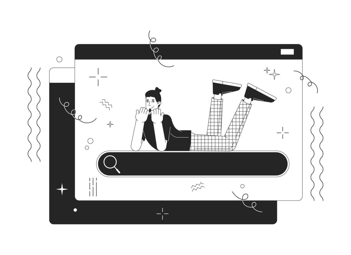 Searching information on internet 2D linear illustration concept. Positive user lying on search field cartoon outline character isolated on white. Data browsing metaphor monochrome vector art Pro Vector