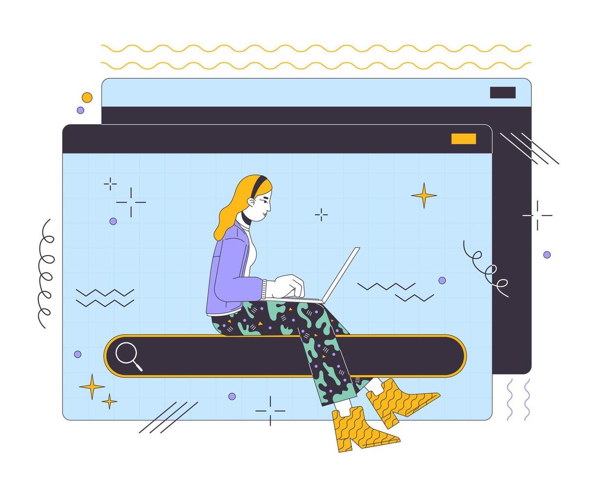 Seeking data online 2D linear illustration concept. Woman searching information via laptop cartoon character isolated on white. Web sources usage metaphor abstract flat vector outline graphic Pro Vector