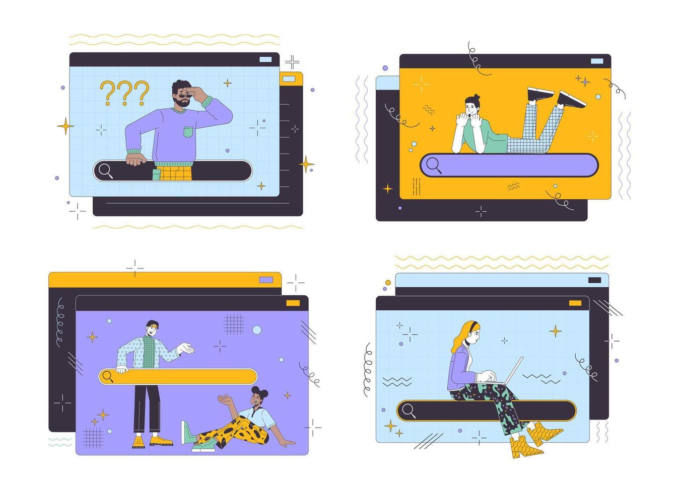 Searching information online 2D linear illustration concept set. Internet users cartoon characters isolated on white collection. Information browsing metaphor abstract flat vector outline graphic Pro Vector