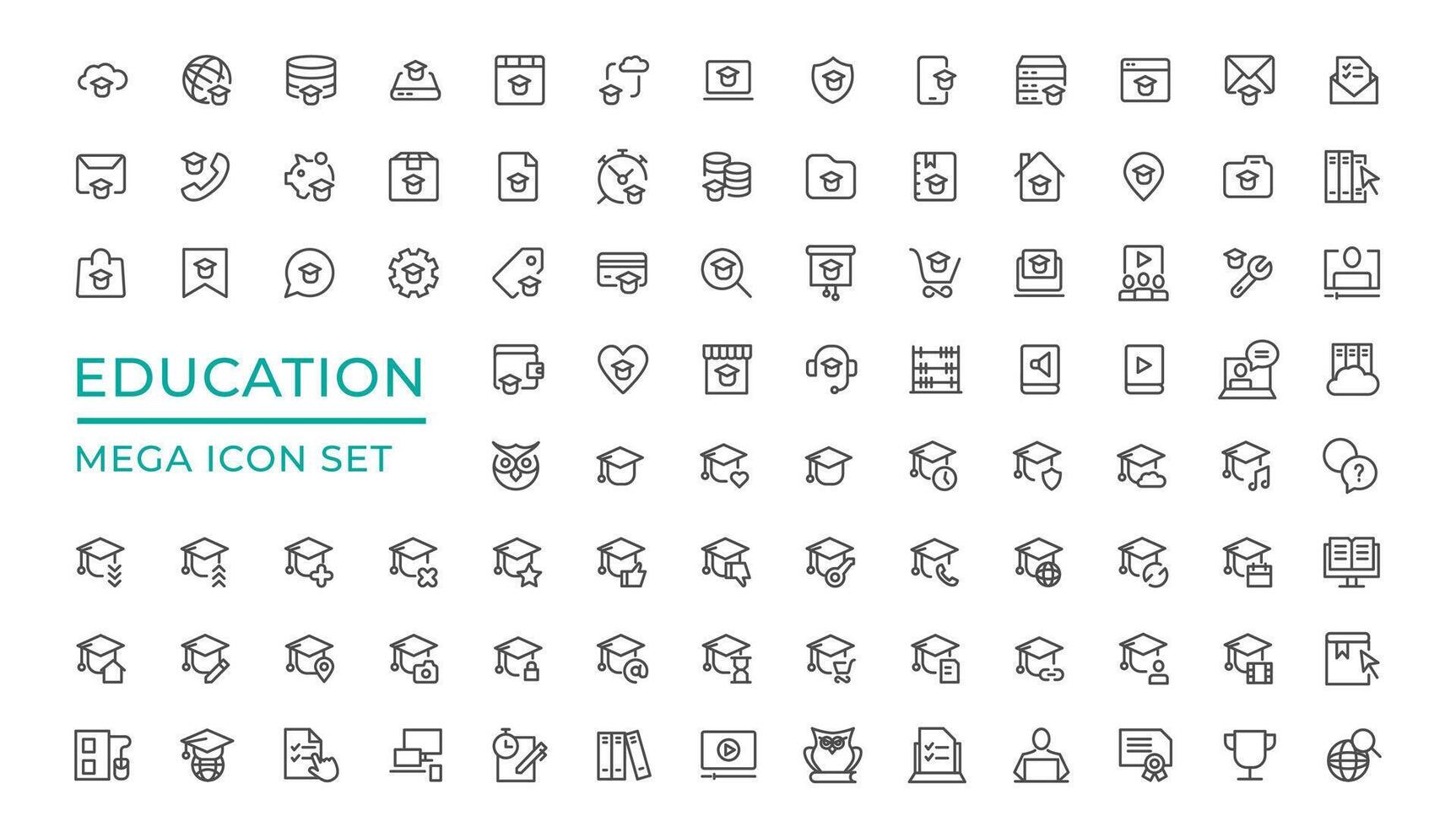 E-learning icon set. Online education icon set. Thin line icons set. Distance learning. Containing video tuition, e-learning, online course, audio course, educational website Pro Vector