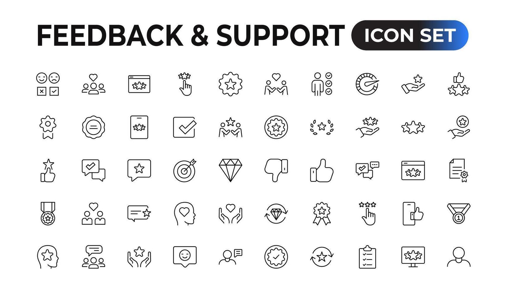 Feedback and Support - Outline Icon Collection. Thin Line Set contains such Icons as Online Help, Helpdesk, Quick Response, Feedback and more. Simple web icons set. Pro Vector