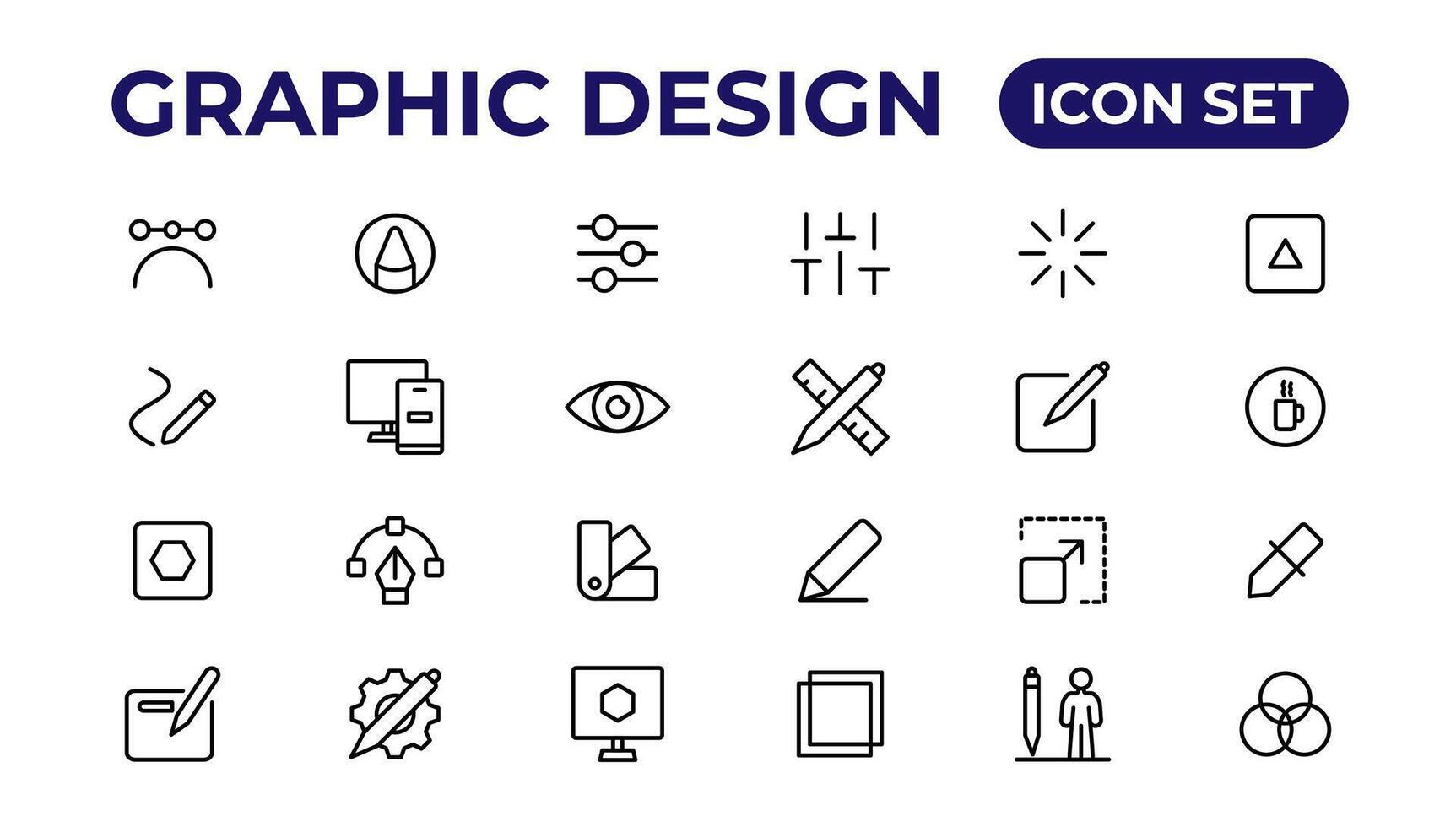 Thin line icons of graphic design. Simple linear icons in a modern style flat, Creative Process. Graphic design, creative package. Pro Vector