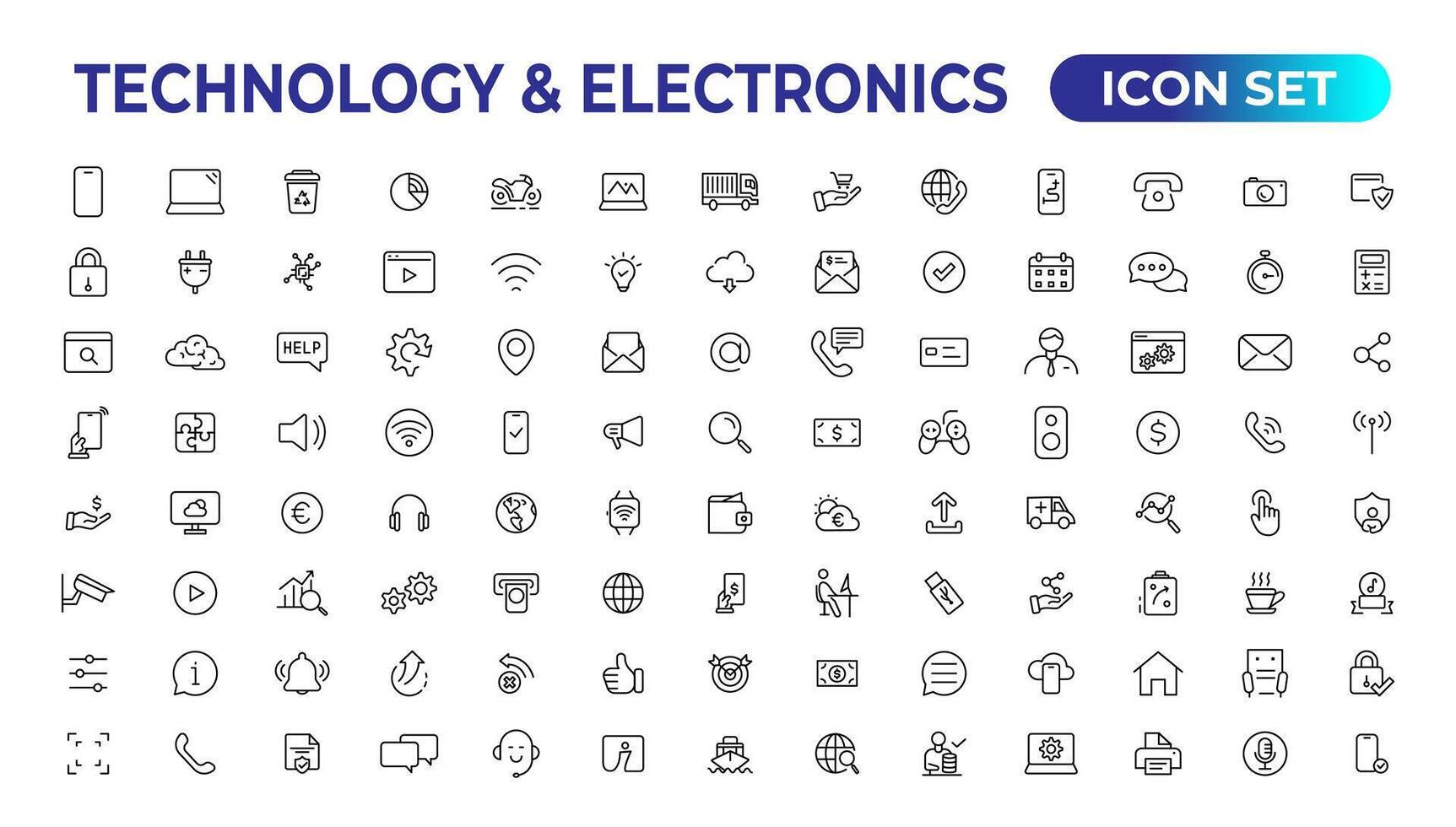 Technology and Electronics and Devices web icons in line style. Device, phone, laptop, communication, smartphone, ecommerce. Vector illustration. Pro Vector
