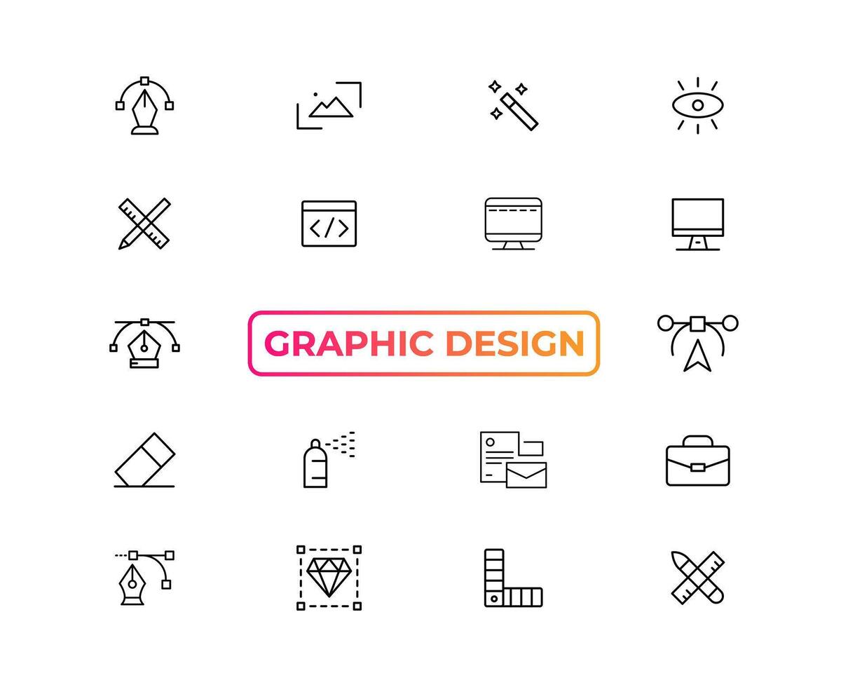 Set of thin line icons of graphic design. Simple linear icons in a modern style flat, Creative Process. Graphic design, creative package, stationary, software and more simple UI, UX vector icons Pro Vector