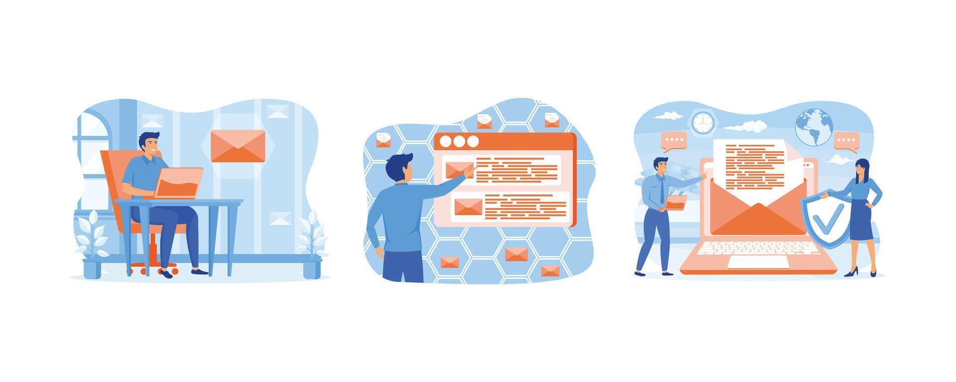 Mail service concept. Man on browser screen checking mailbox online. Mail service, e-mail message, mail notification sending. Set flat vector modern illustration Pro Vector