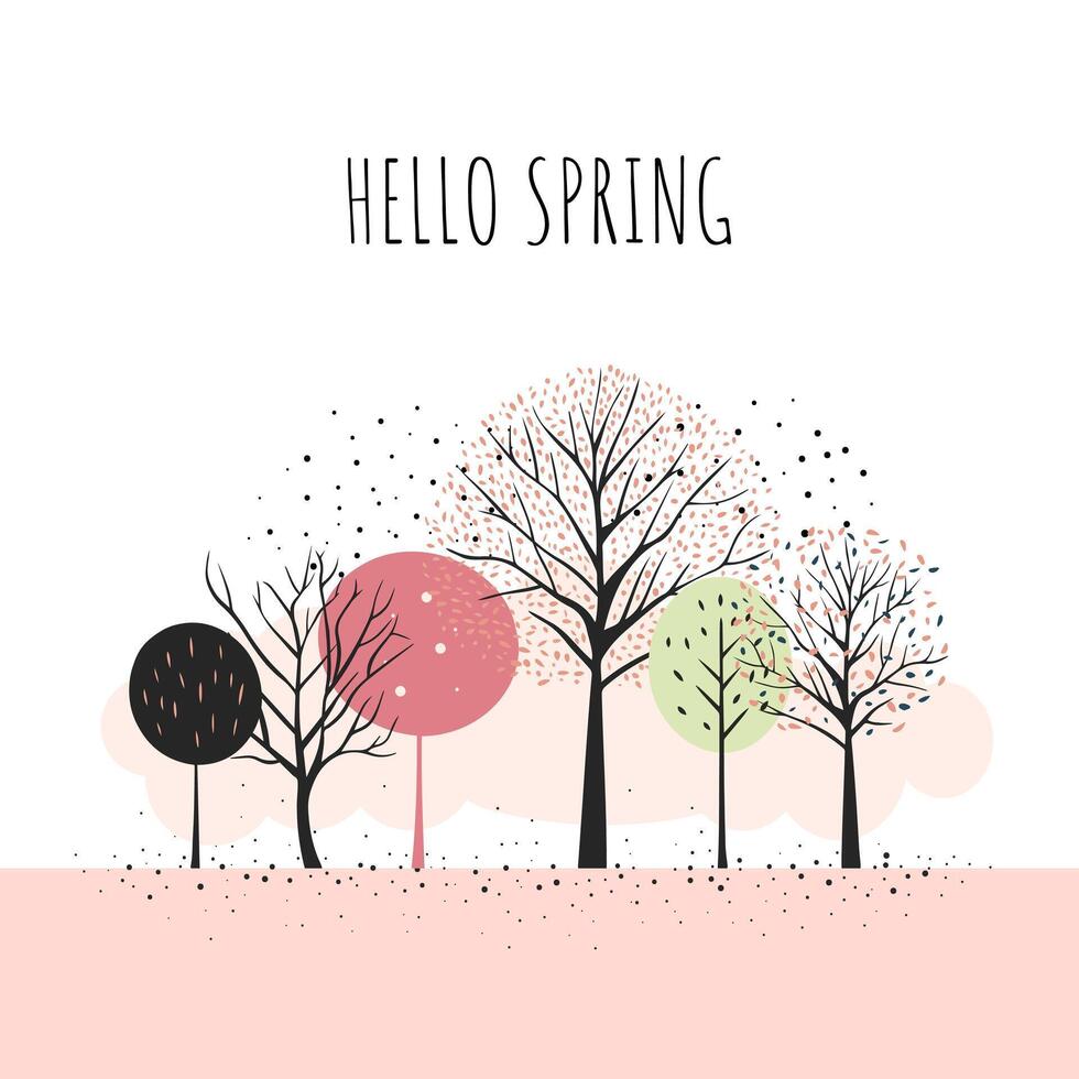 Fairy trees. Scandinavian trees composition. Springtime trees. Cartoon fantasy frame. Hello spring card. Pro Vector