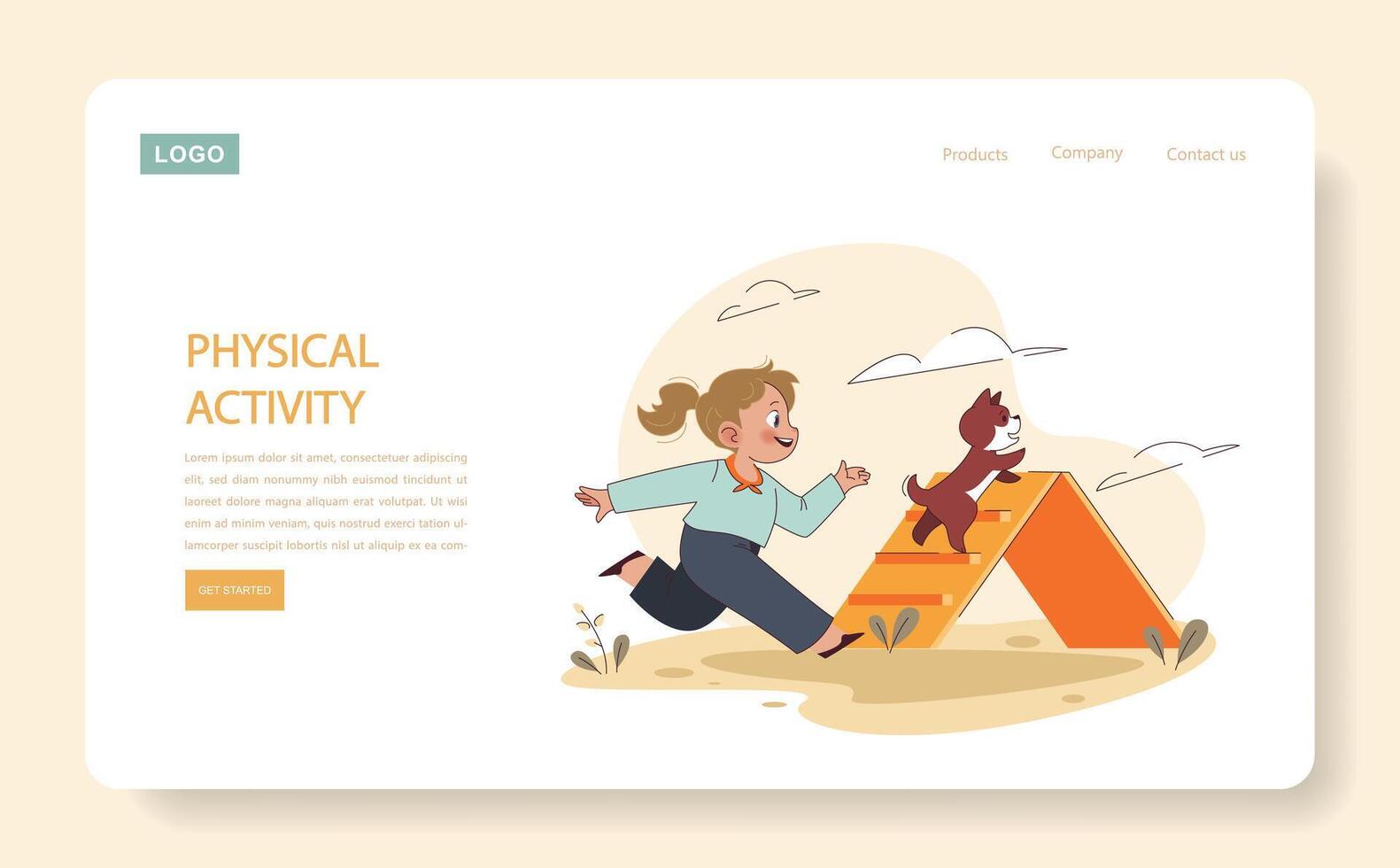 Physical Activity web or landing. Joyful child and dog engage in playful Pro Vector