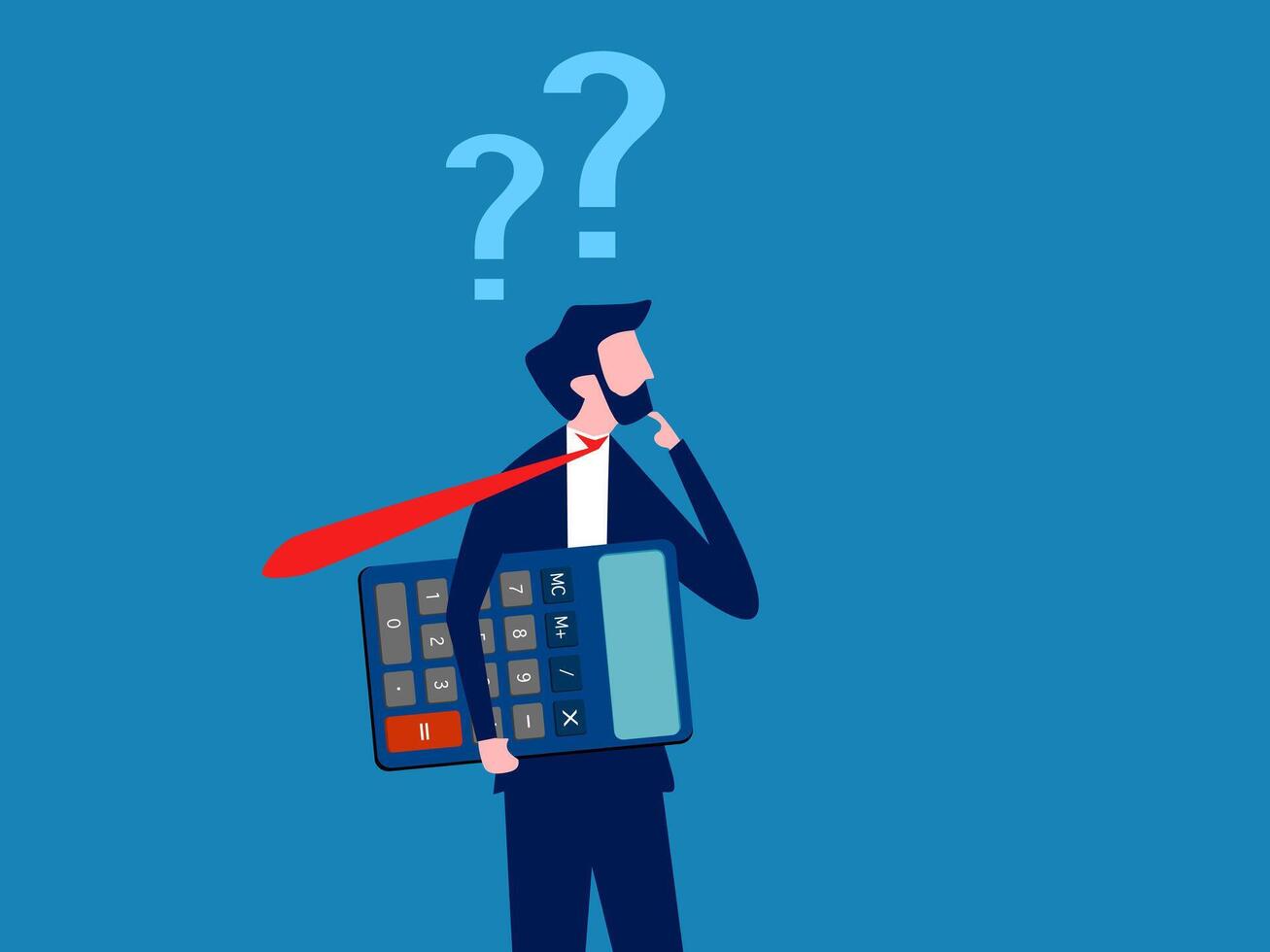 Think about numbers. Businessman holding a calculator thinking about calculations Pro Vector