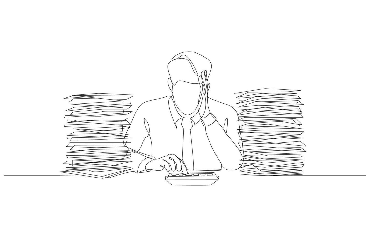 Continuous one line drawing of businessman using calculator among piles of documents, accounting and internal auditing concept, single line art. Pro Vector