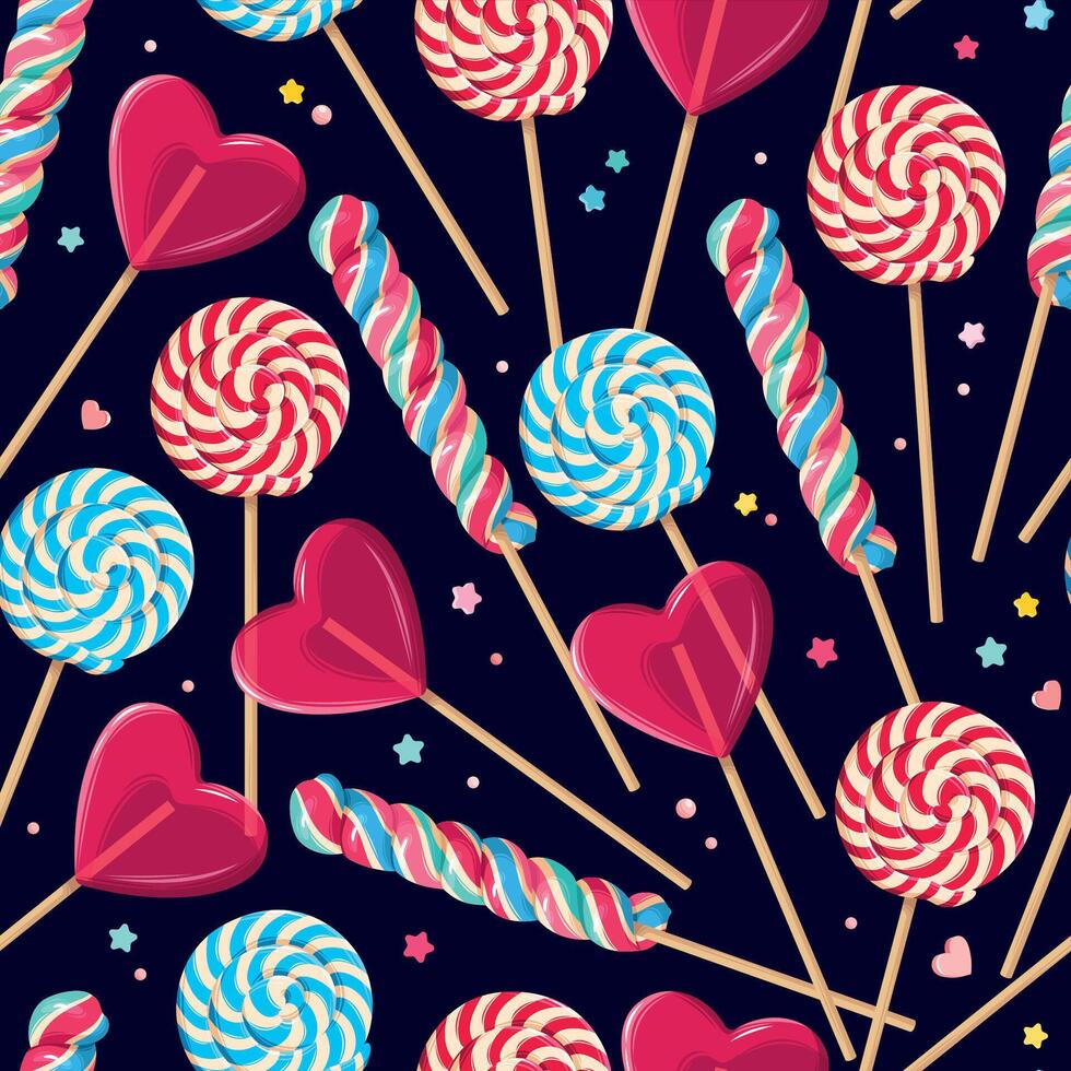 Vector seamless pattern with heart shaped lollipops on dark background Pro Vector