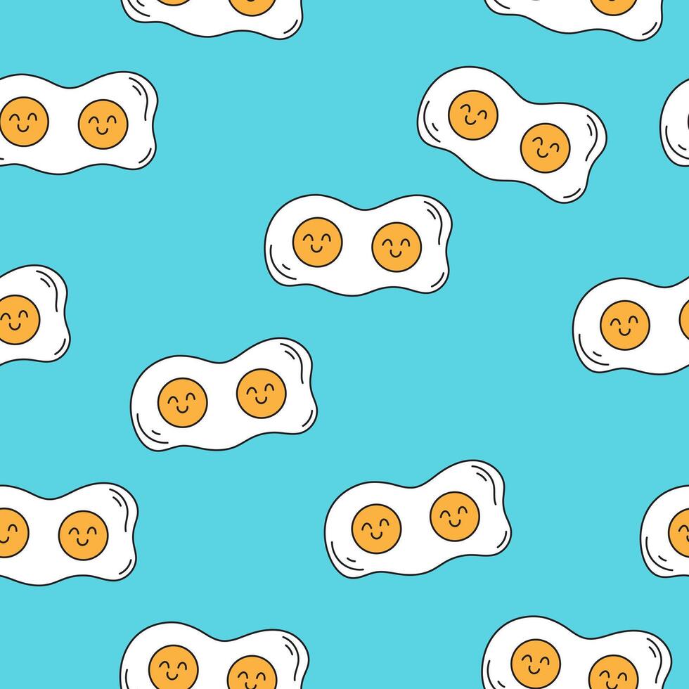 Seamless pattern with fried eggs with anthropomorphic face on turquoise background. Kawaii food Pro Vector