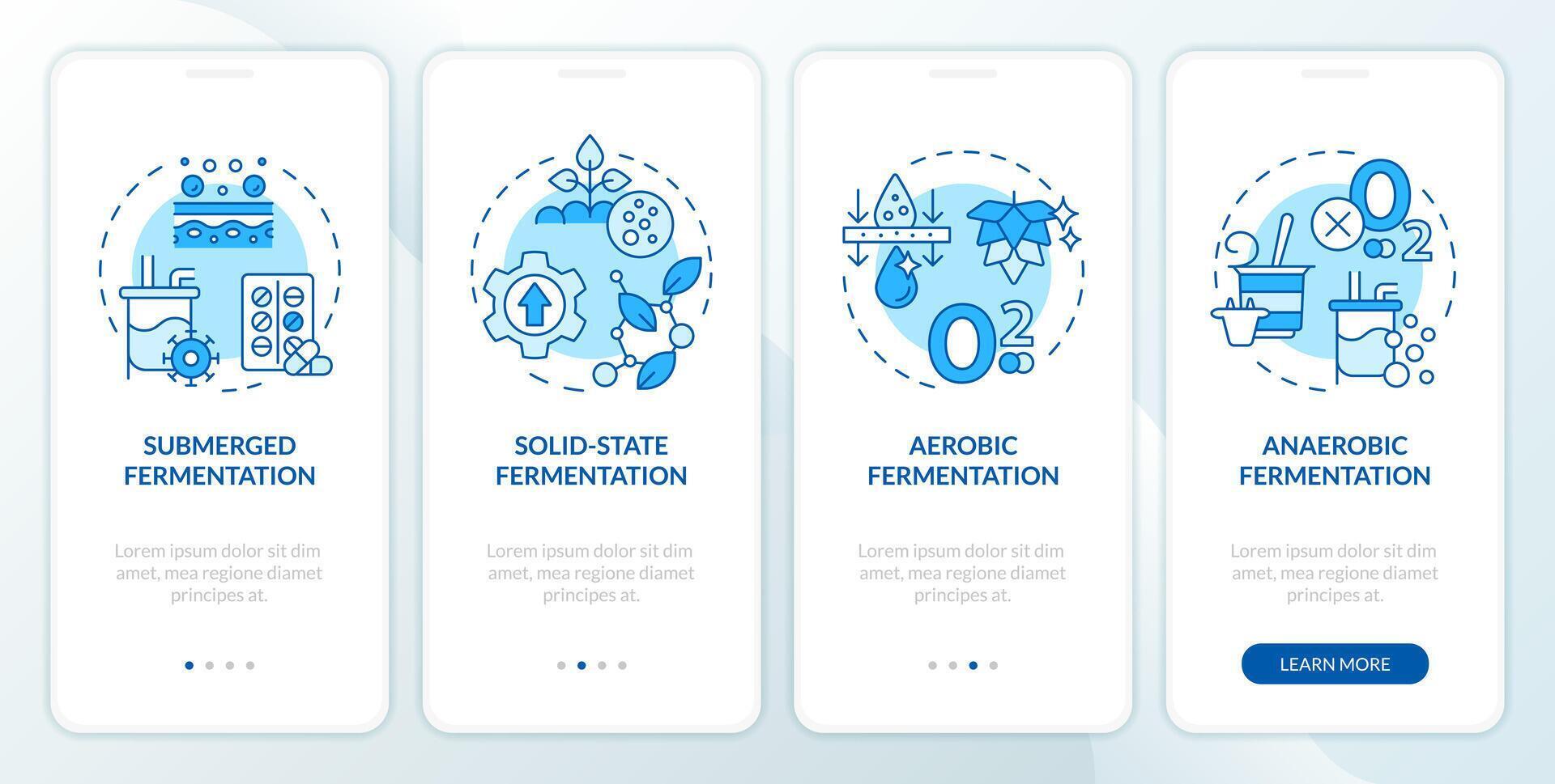 Fermentation processing blue onboarding mobile app screen. Walkthrough 4 steps editable graphic instructions with linear concepts. UI, UX, GUI template Pro Vector