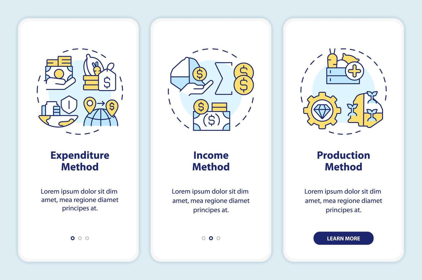 GDP calculating onboarding mobile app screen. Economic growth. Walkthrough 3 steps editable graphic instructions with linear concepts. UI, UX, GUI template Pro Vector