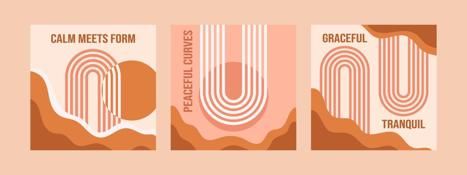 Minimalist geometric zen arches square post social media collection with text - Calm, Peacful, Graceful. Abstract boho shapes in a retro aesthetic for versatile design use. Vector concept design. Pro Vector