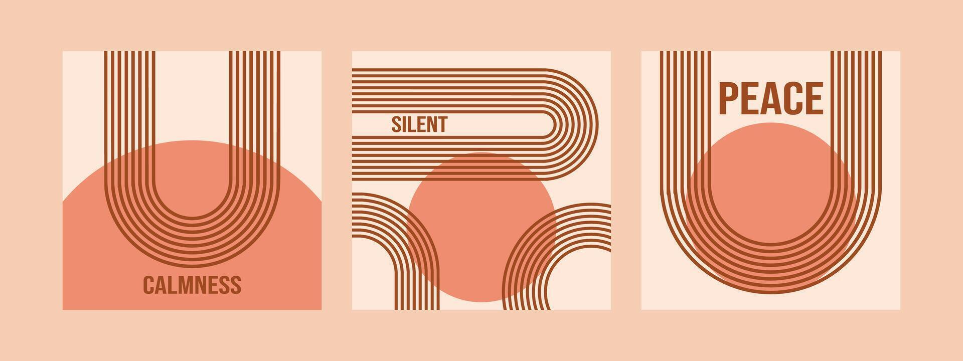Minimalist geometric zen arches square post social media collection with text - Calmness, Silent and Peace. Abstract boho shapes in a retro aesthetic for versatile design use. Vector concept design. Pro Vector