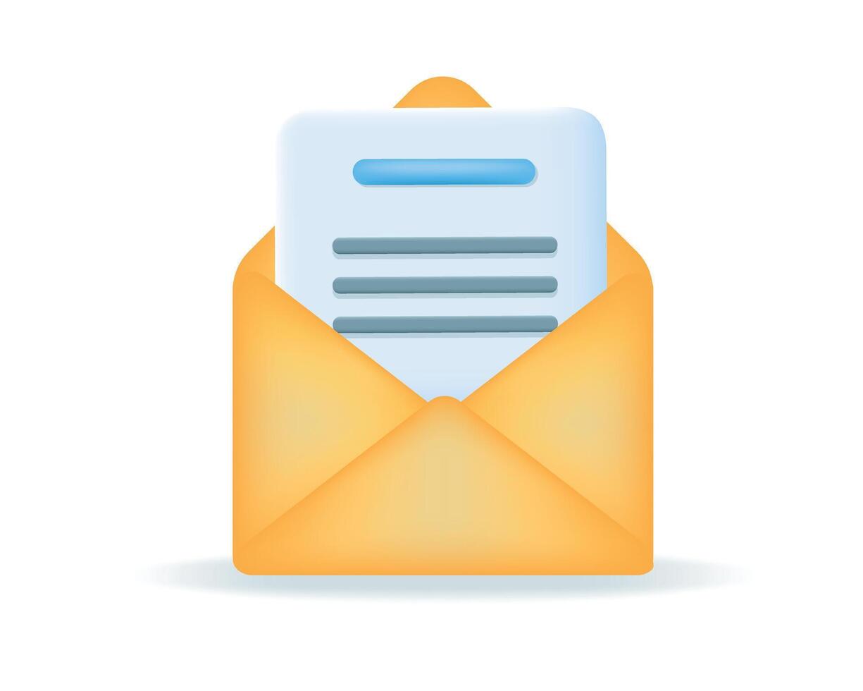 Open envelope with letter, business document, note paper card, mail with message. Send and receive correspondence concept 3d vector illustration isolated on white background. Pro Vector