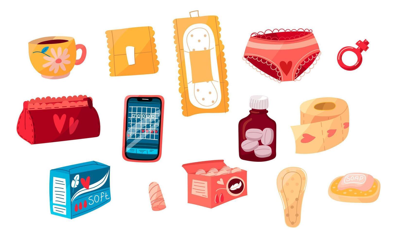 A set of menstruation pads, underpants, a phone, a box of pads, soap, pills, a box of tampons and others. The concept of a woman's regular menstrual cycle. Vector illustration of isolated objects Pro Vector