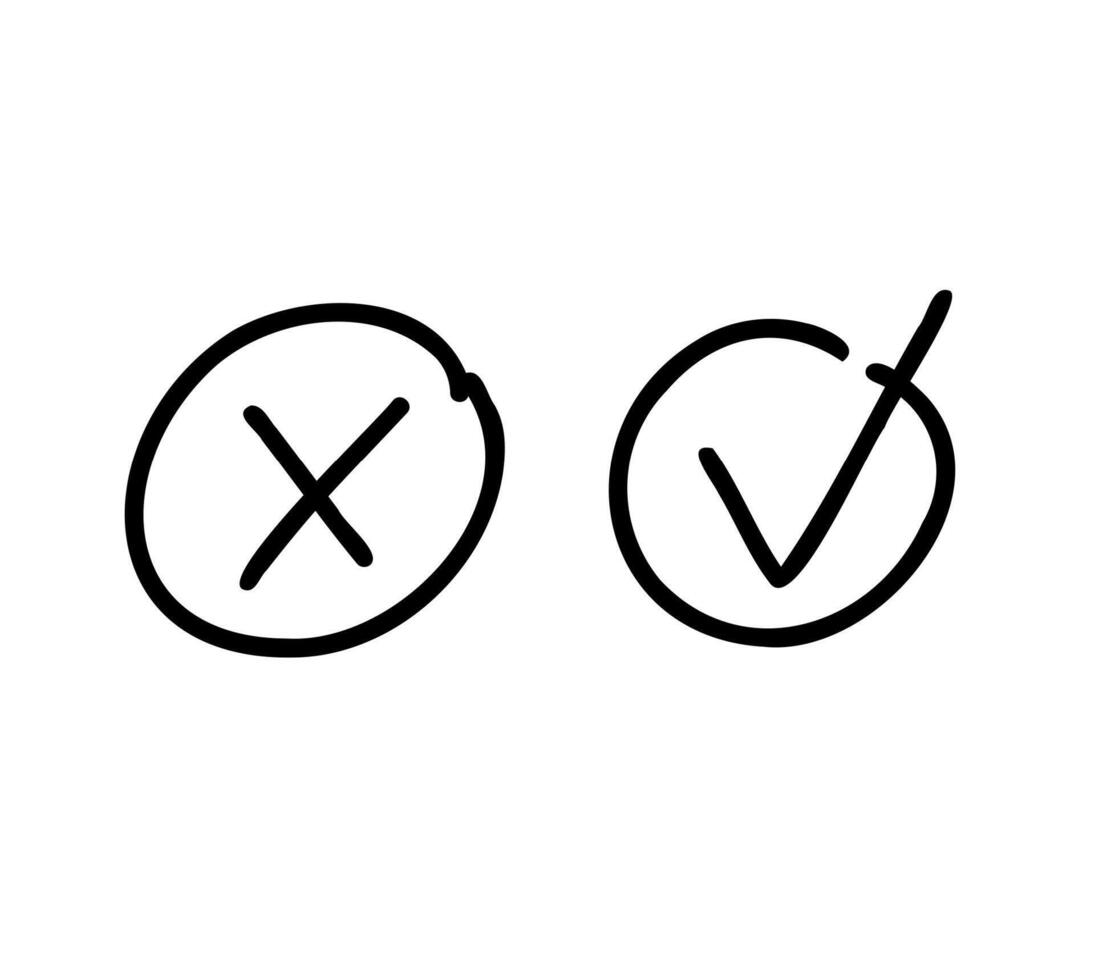Hand drawn check and cross marks in round boxes. Vector black line icons isolated on white background.