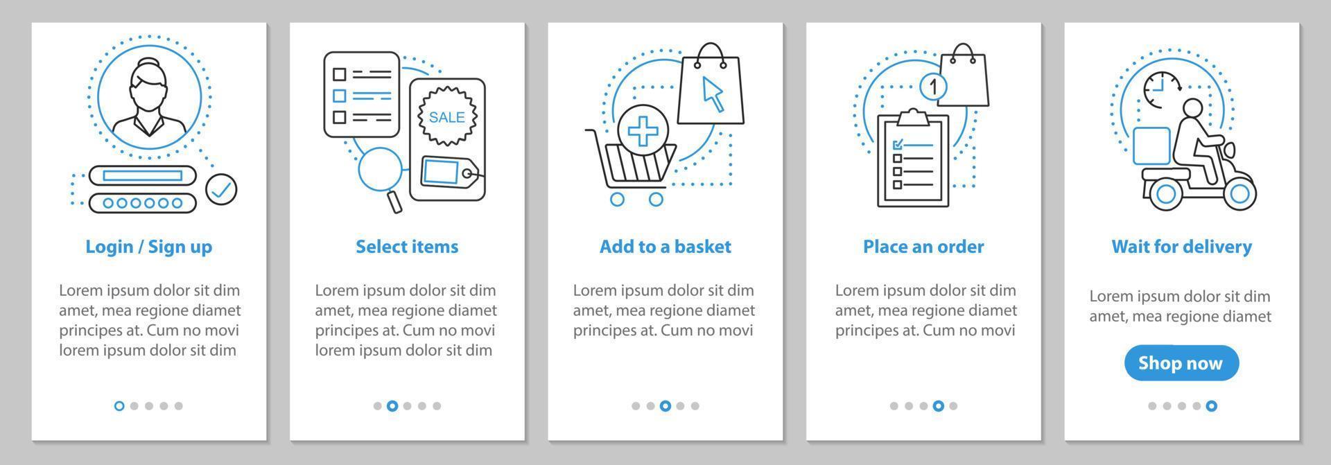 Online shopping onboarding mobile app page screen with linear concepts. Digital path to purchase steps graphic instructions. UX, UI, GUI vector template with illustrations Pro Vector