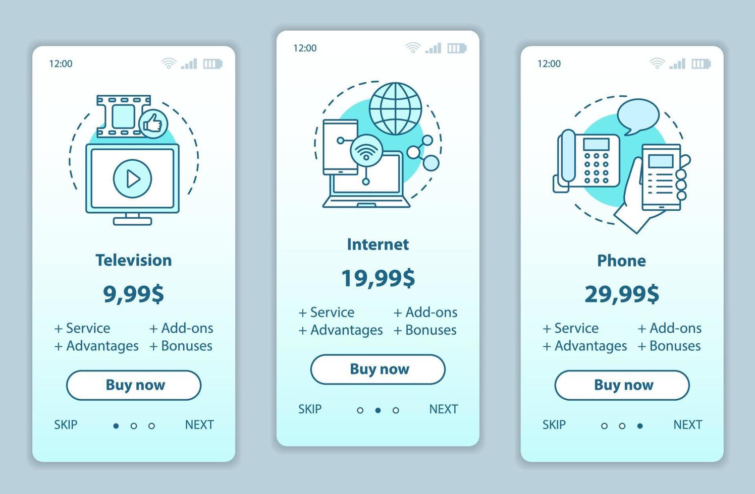 TV, phone, internet bundle onboarding mobile app screens with service prices. Tariff plans and packages steps. Walkthrough website pages templates. Smartphone payment web page layout Pro Vector
