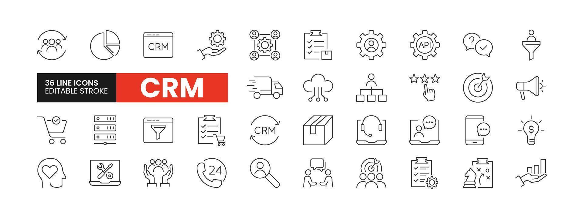 Set of 36 Customer Relationship Management line icons set. CRM outline icons with editable stroke collection. Includes Data Analysis, Support, Cloud CRM, Strategy, Customer Relationship, and More. Pro Vector