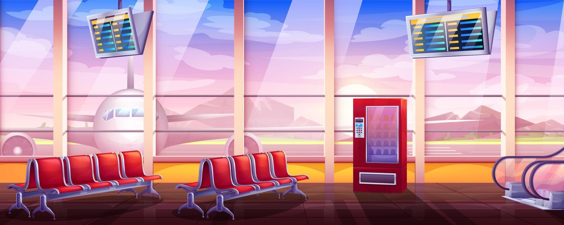 Cartoon vector illustration of empty airport lounge with waiting area. Terminal interior with schedule display, seats, escalator and vending machine. Departure hall with window and aircraft outside Pro Vector