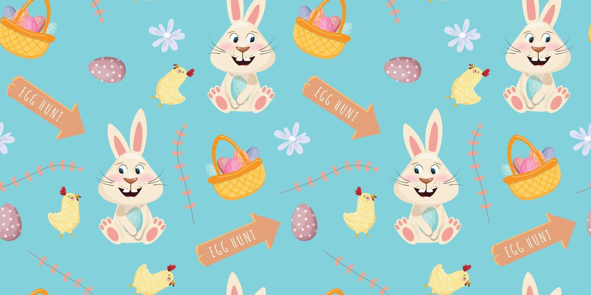 Easter seamless pattern with bunny, chicks and shields with text egg hunt Pro Vector
