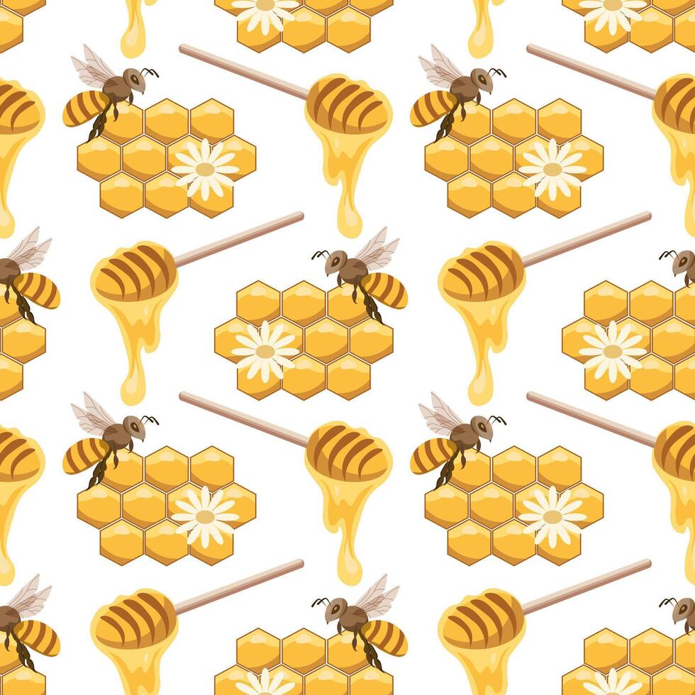 Seamless pattern, spoons with honey, honeycombs and bees. Background, print, vector Pro Vector