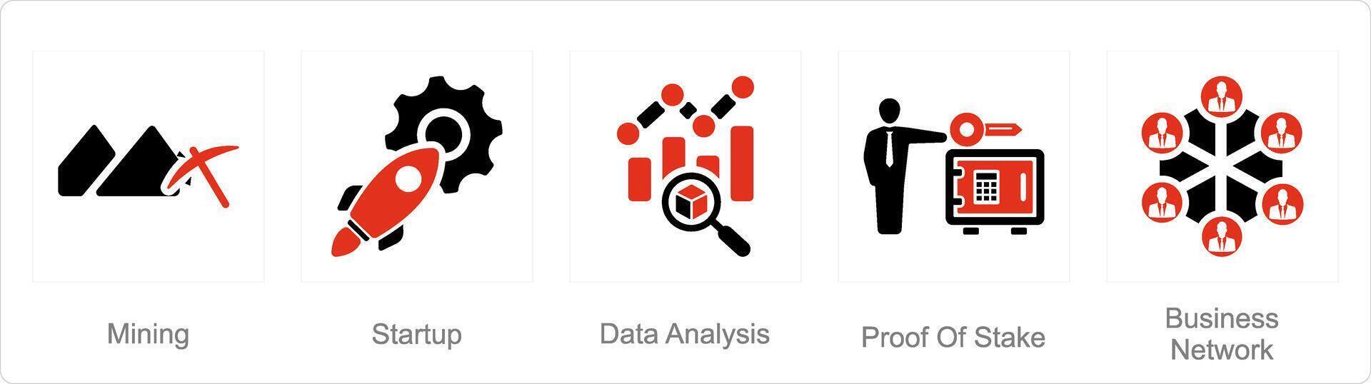 A set of 5 Blockchain icons as mining, startup, data analysis Pro Vector