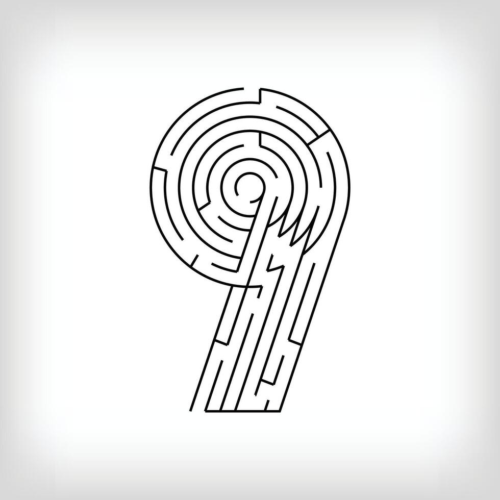 Unique linear number 9 maze puzzle. The most confusing gaming activity. Pro Vector