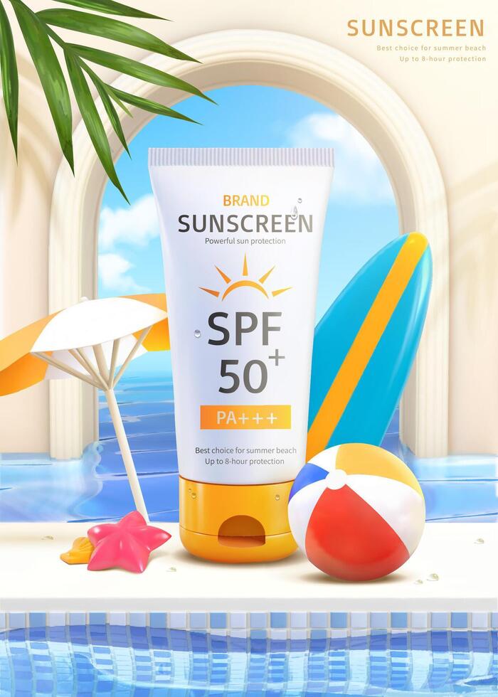 3d summer poolside sunscreen ad. Illustration of sunblock tube product displayed aside water pool with beach objects standing around Pro Vector