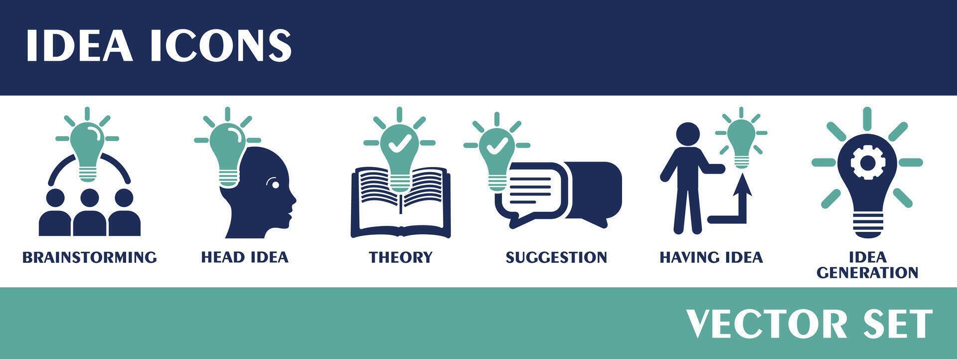 Idea icons. Containing brainstorming, head idea, theory, suggestion, having idea, idea generation. Flat design vector set Pro Vector