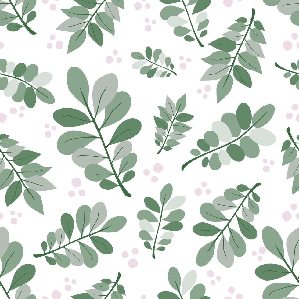 Green branches with leaves on white backdrop vector seamless pattern. Creative art texture for printing on various surfaces, textile, wrapping, packages, apparel... or use in graphic design projects. Pro Vector