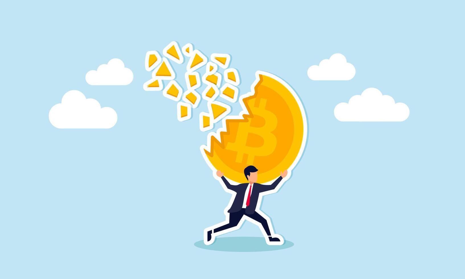 Bitcoin price drop leads investors or traders to lose money, crypto value diminishing significantly concept, frustrated investor trader running away with his dissolving, crash into dust Bitcoin. Pro Vector