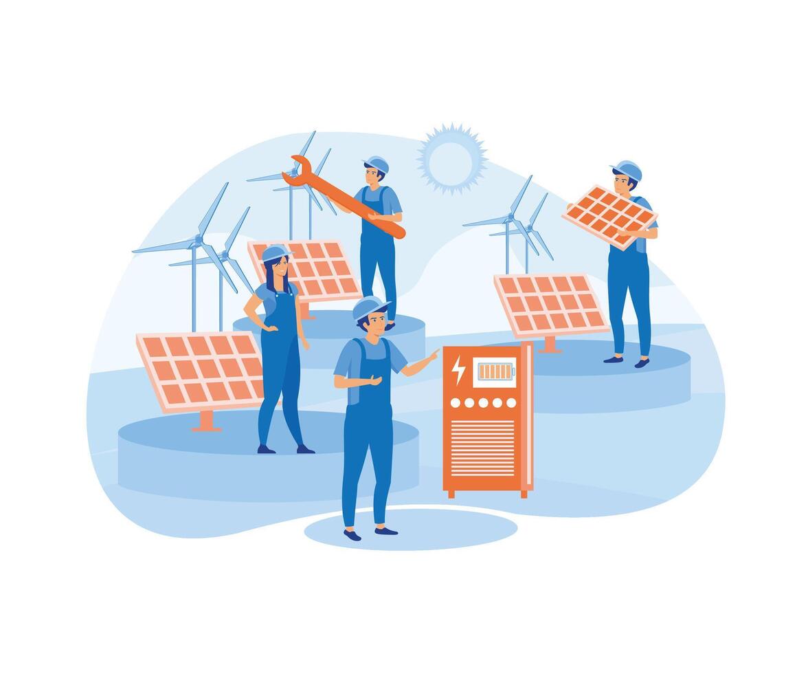 Solar energy system concept. Installing solar modules. Field service technician, worker, engineer and manager. Scene with professional team and panels. flat vector modern illustration Pro Vector
