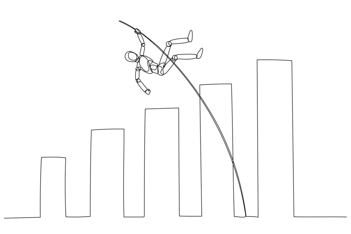 simple line drawing depicting a humanoid pole vaulting over bar graphs, symbolizing overcoming obstacles or achieving goals in the context of data or business Pro Vector