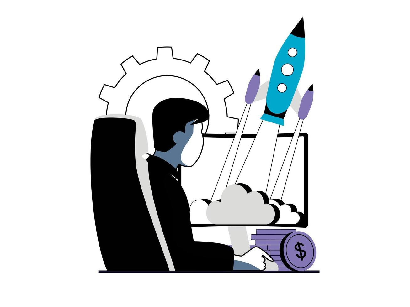 Startup concept with character situation. Man develops plan and strategy, creates and launches success business, optimizes and improves. Vector illustration with people scene in flat design for web Pro Vector