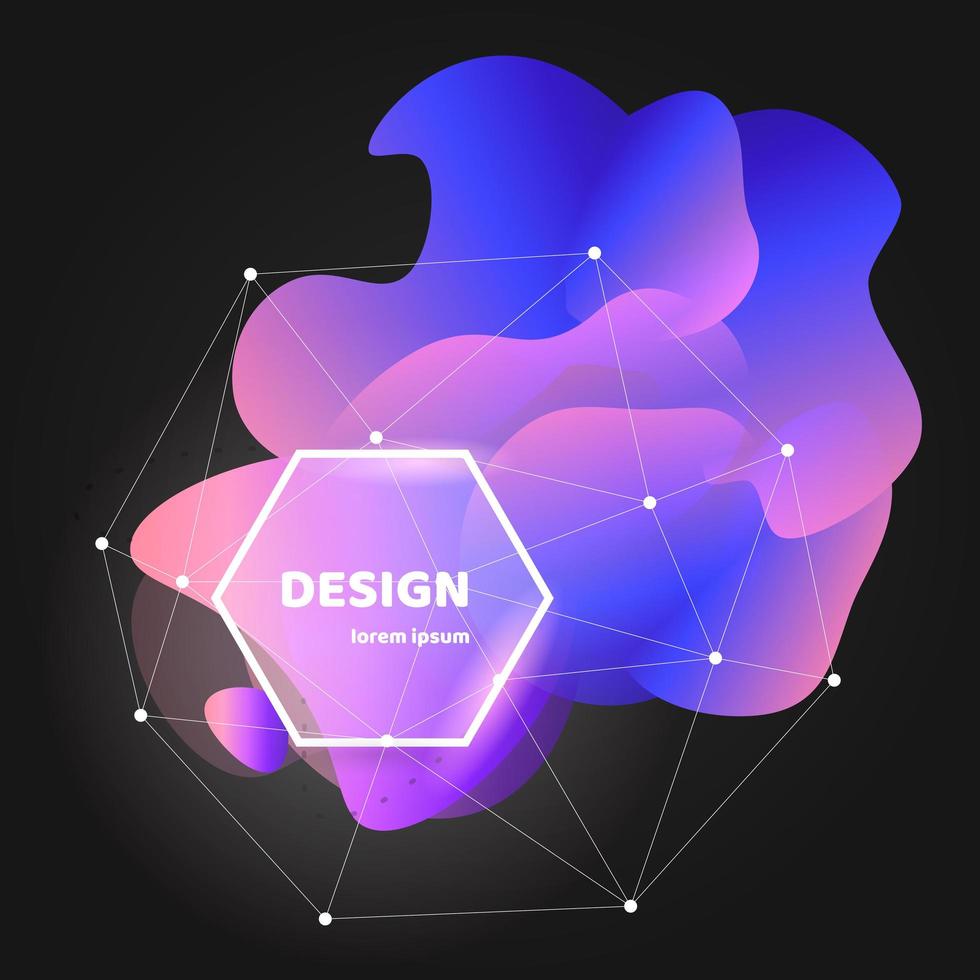 Abstract gradient wavy shape with white frame and polygon mesh on black background. Trendy liquid or fluid flow banner template. Isolated vector illustration.