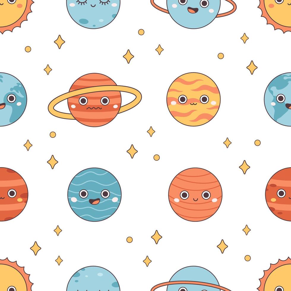 Seamless pattern with Solar System and space. Trendy groovy cartoon planet characters Pro Vector
