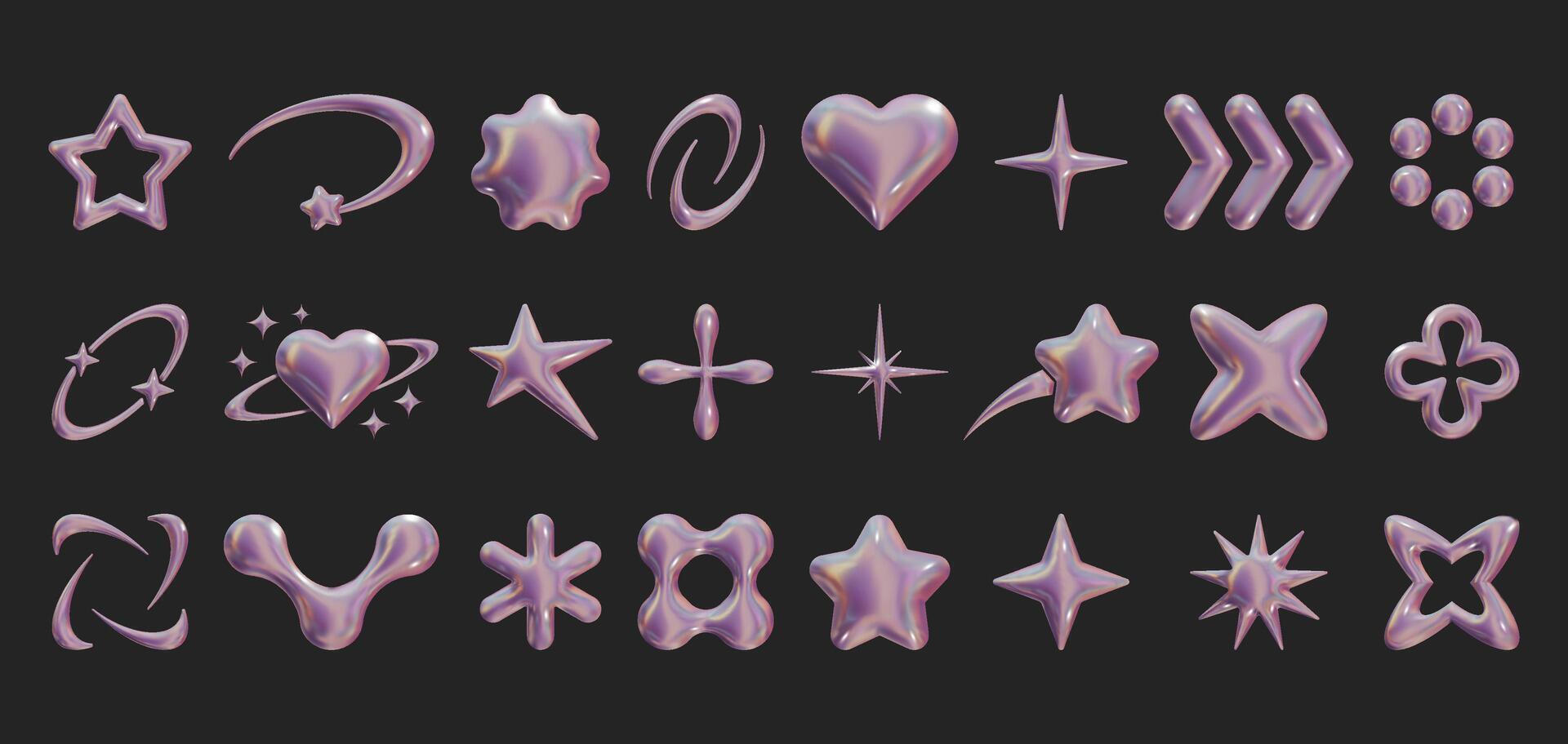Set of Y2k geometric 3D render holographic shapes trendy retro futuristic design elements, infographic shapes. Modern concept with symbols and objects, star, heart illustration for UI and UX Pro Vector