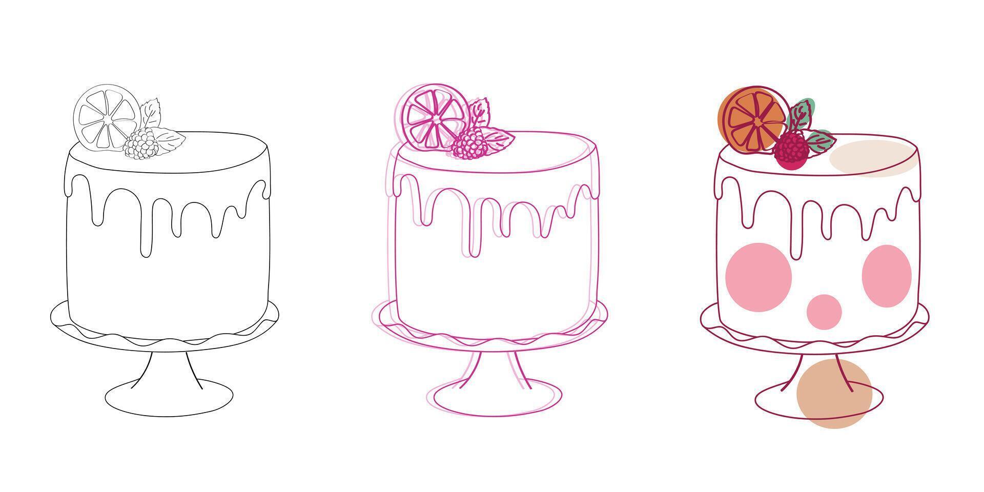 Three distinct cakes, each showcasing different flavors and designs, are displayed against a clean white backdrop. The cakes vary in size, shape, and toppings, creating a visually appealing contrast Pro Vector