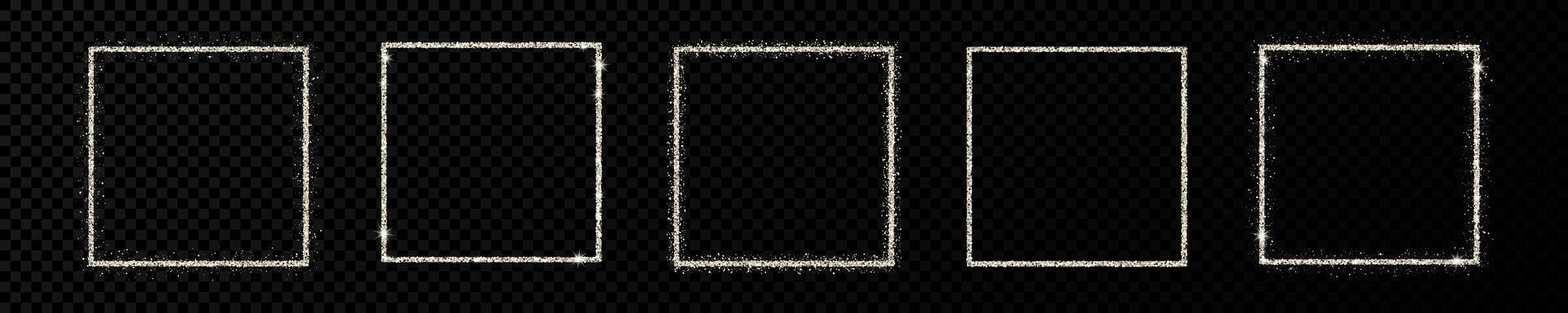 Set of five silver glitter frames. Square frame with shiny stars and sparkles on dark background. illustration Pro Vector